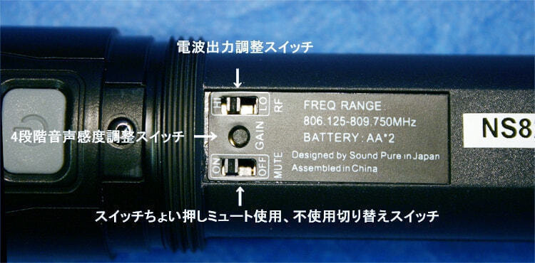 マイク電源を入れ ペン先等で軽く3 秒ほど押すとGAIN 表示になり押すたびに0dB 10dB 20dB -10dB の順で入力感度が変わります。-10dB=最小感度 20dB=最大感度と成りインタビューや静かな音で使用する時10dB~20dB に合わせます、打楽器やハードな音量時には-10dB に調整して下さい。また接続する機器・使用等にあわせて調整して下さい。(出荷時0dB注意ゲインスイッチはマイクロスイッチのためつよく押さないで下さい。ミュートスイッチが0FF 時に音声入力調節ができます。)