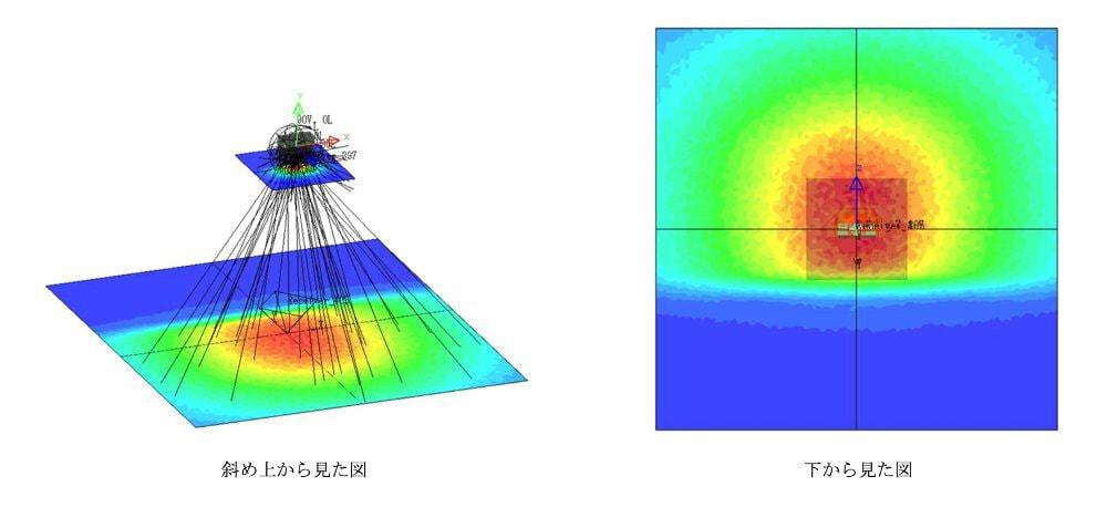 UVC ステアライザー マークIIの光学シミュレーション結果 放射照度分布解析 下方UVC ステアライザー筐体の直下及び筐体直下から 1m 下方の放射照度分布を解析した。 解析の結果、筐体の直下で 最短約 6 秒、筐体直下から 1m 下方で最短 8 分で、254nm における許容曝露量6mJ/cm2 に達する。(赤色で分布した箇所が高強度)